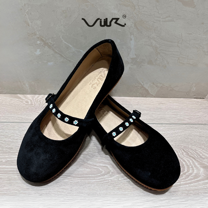 Thân giày được làm từ da bò lộn 100% cao cấp, mềm mại và bền đẹp theo thời gian. Điểm nhấn nổi bật nằm ở chi tiết hoa nhỏ kết cườm trên quai, tạo nên nét duyên dáng và tinh tế cho tổng thể thiết kế.